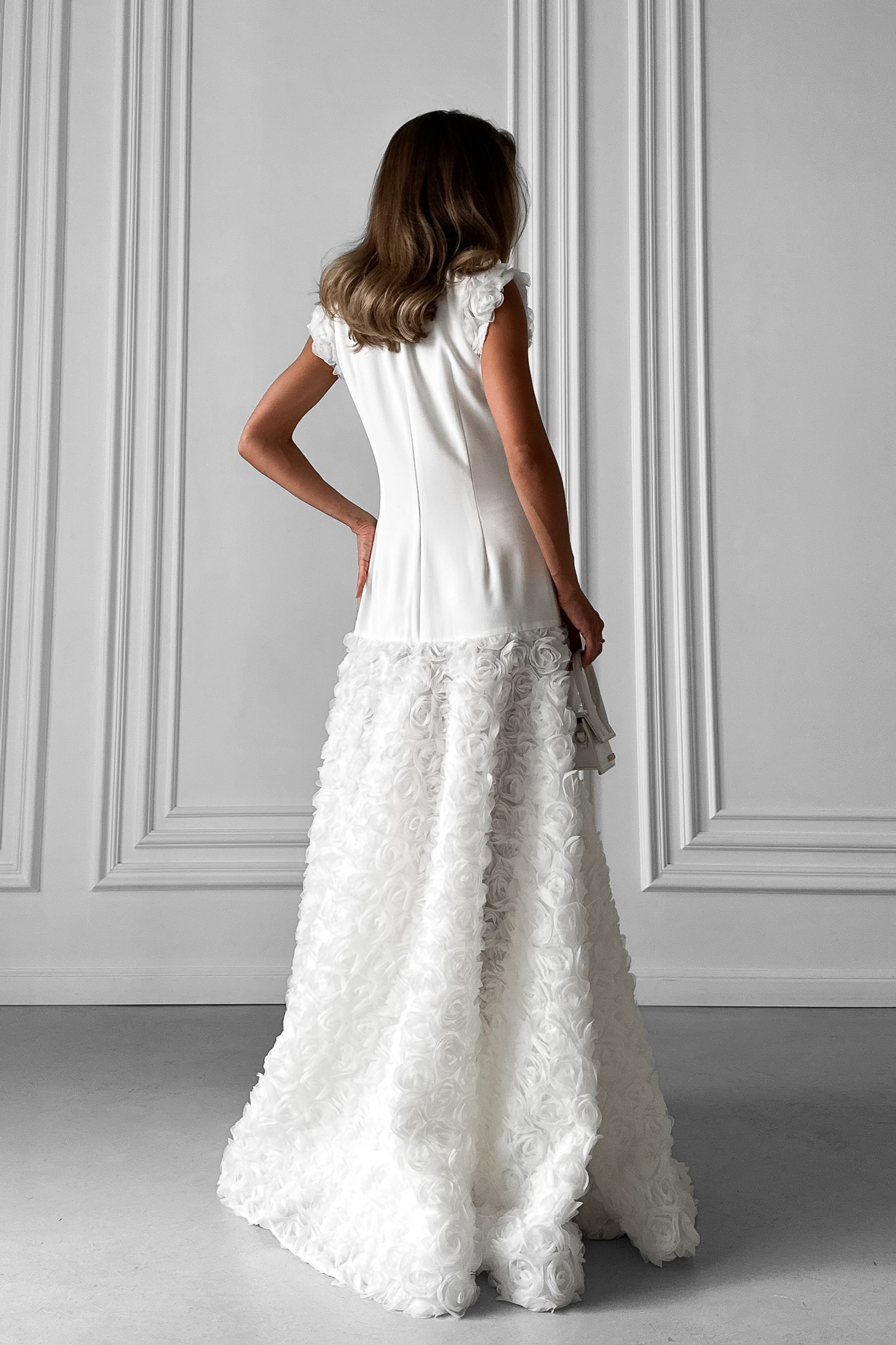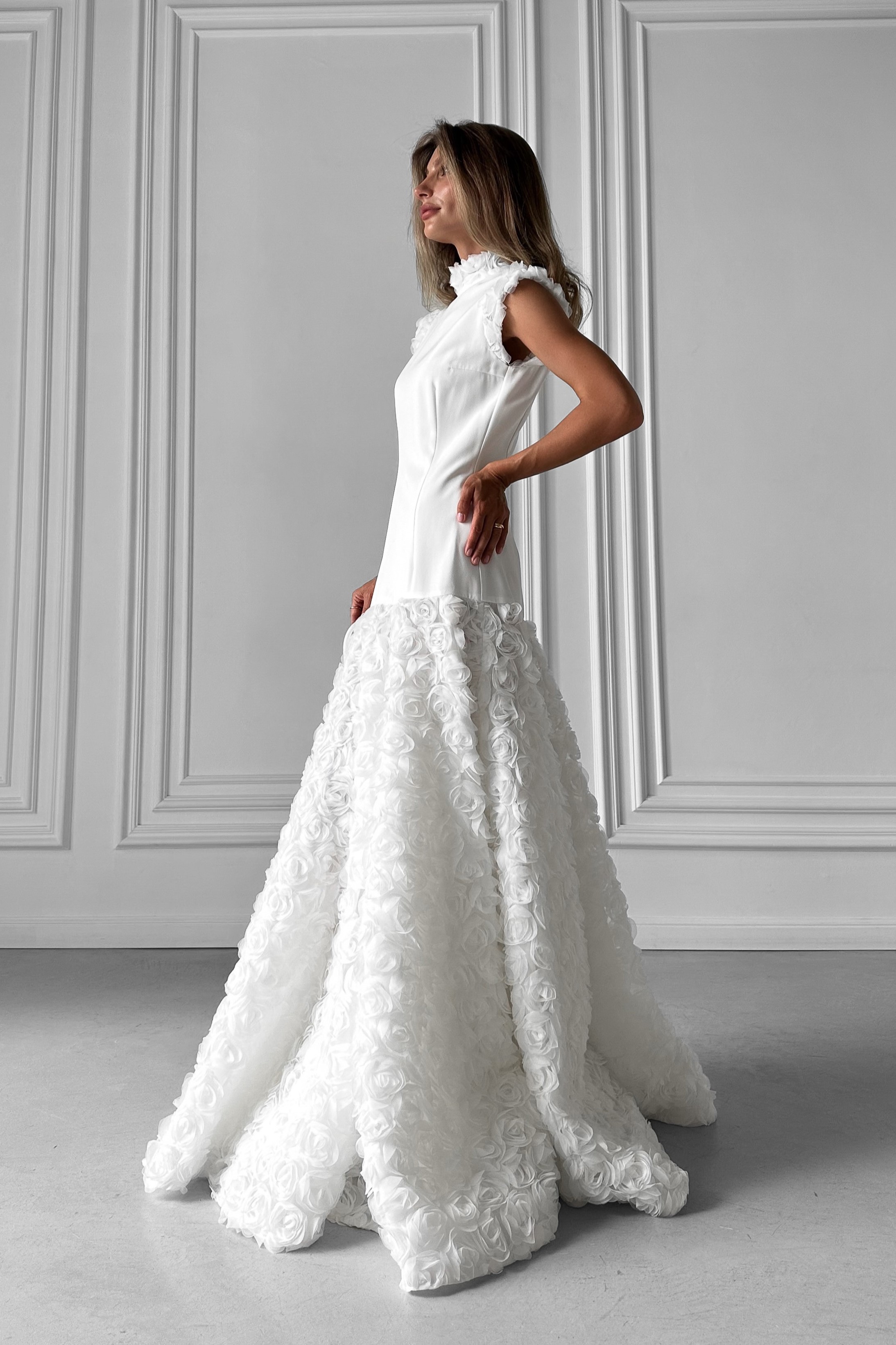 - З коміром стійкою, з крильцями, з довгою спідницею сонце від стегна, з потайною застібкою на спинці