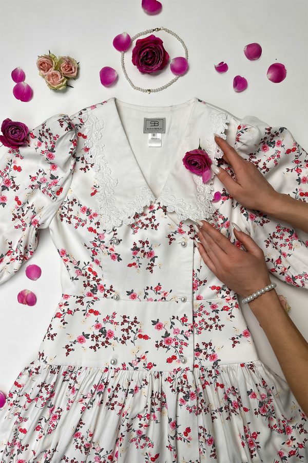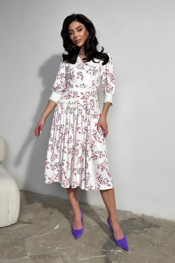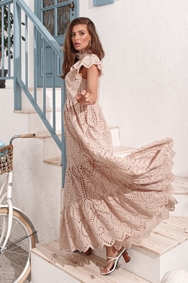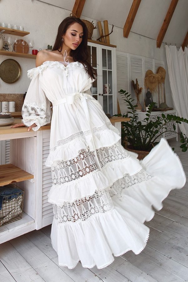 Ніжний сарафан з бавовни на тонких бретелях, з пишною спідницею зі вставками з мережива – ідеальний для літніх прогулянок або коктейлю, а також для пляжного відпочинку.