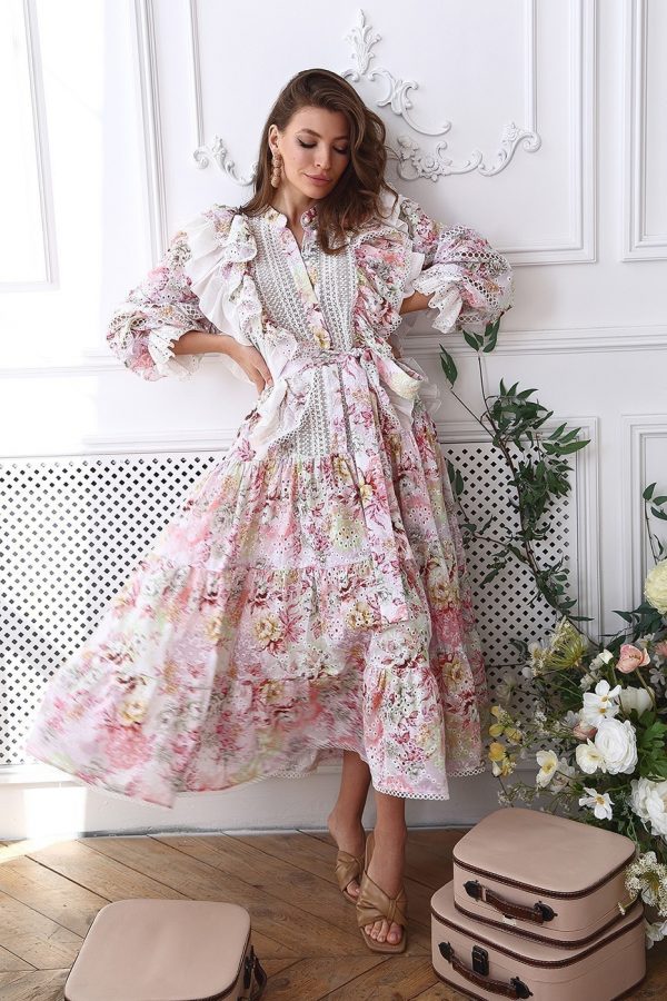 Стильне плаття сорочка з довгими рукавами, з короткою пишною спідницею і вишуканою обробкою з мережива чудово підійде дівчині в повсякденному житті або на відпочинку влітку. Натуральна тканина приємно сідає по фігурі, підкреслюючи всі переваги жіночого тіла. Можна носити із взуттям на підборах або на плоскому ходу.