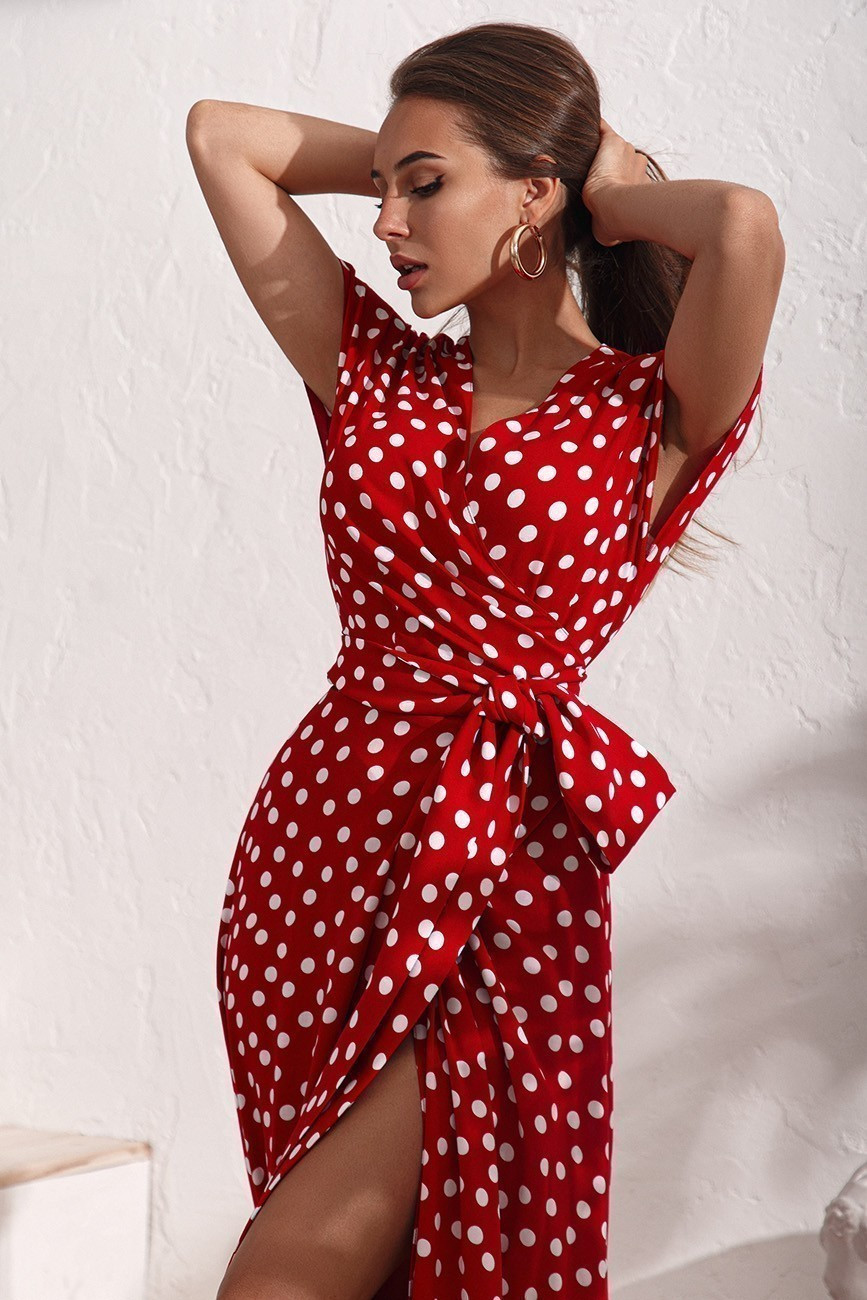 Плаття на запах зі спущеним плечем, у підлогу в горошок.