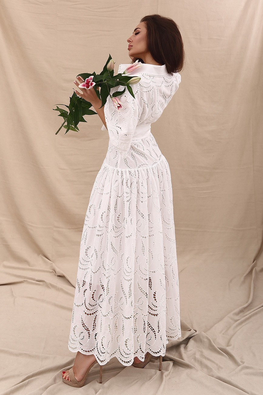 Форма: з коміром, зі спущеними плечима, з пишними рукавами, з кокеткою, із застібкою на гудзики, з пишною спідницею, на підлогу.
