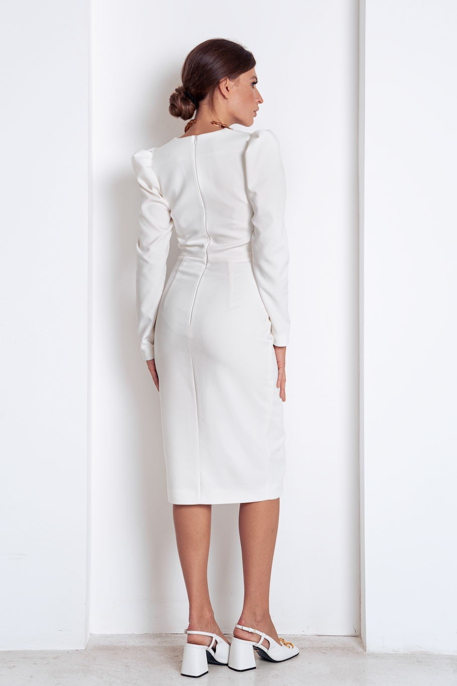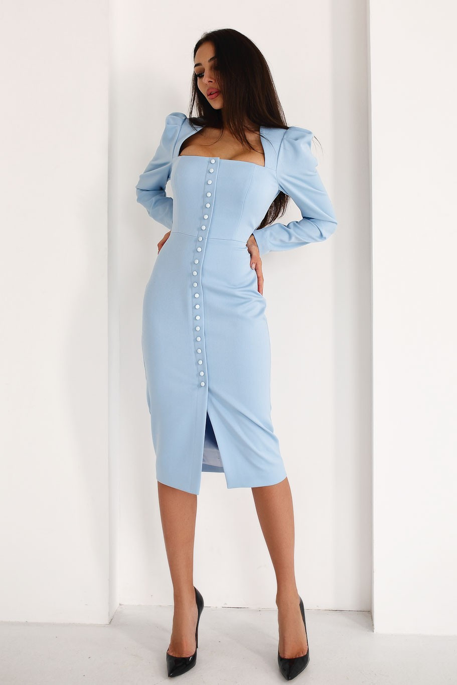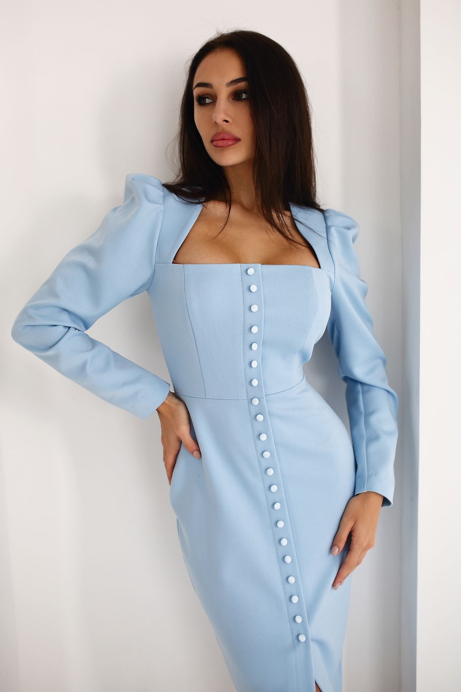 Страшна силуетна сукня з шикарною фігурною зоною декольте, довгими рукавами і маленькими ґудзиками спереду – чудовий вибір справжніх модниць.