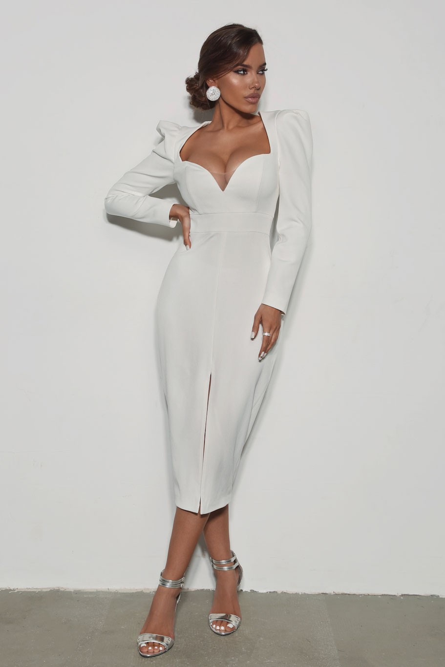 Шикарна силуетна сукня з фігурною зоною декольте, довгими рукавами зі складками на плечах, з елегантним розрізом спереду – чудовий вибір справжніх модниць.