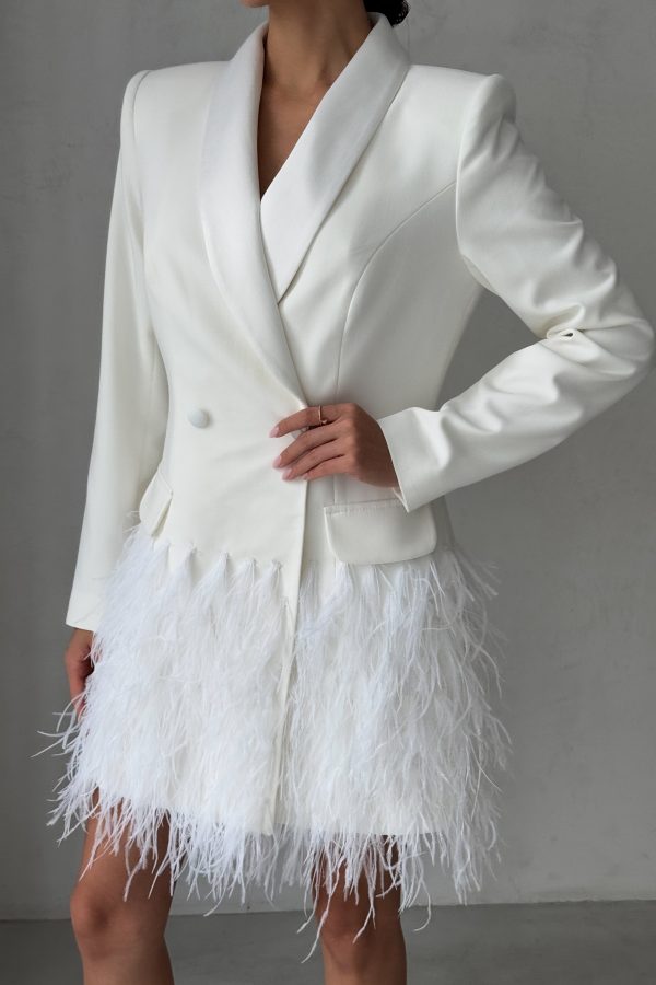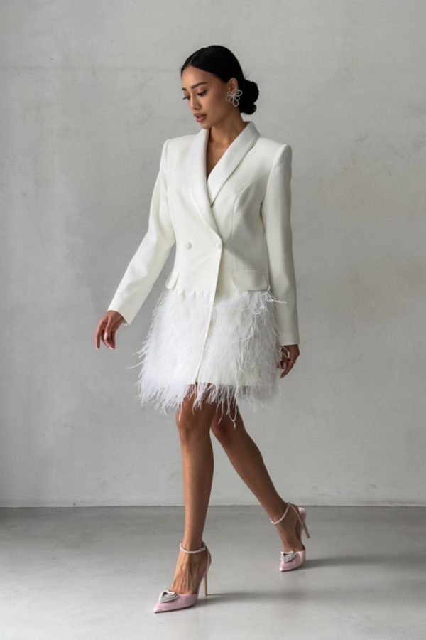Чудова сукня з відкритою спиною з пір’ячками внизу і з поясом із пір’я.