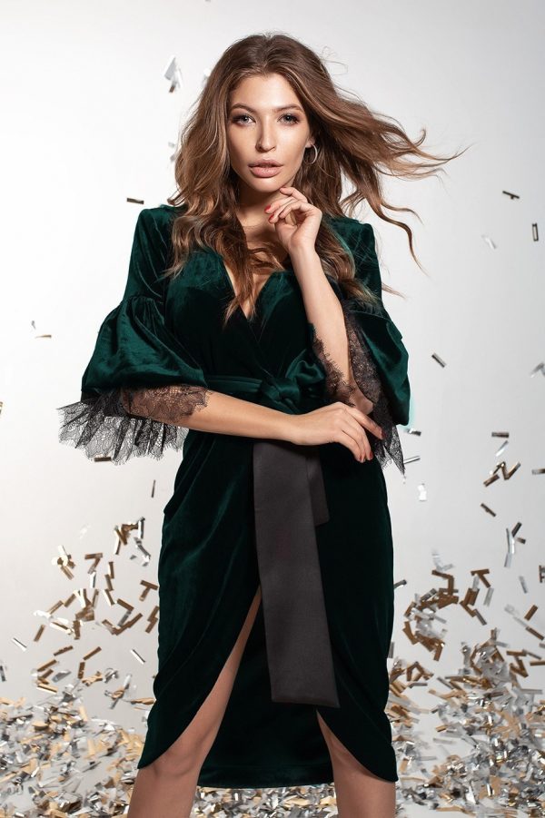 Оксамитова сукня з воланами та рукавами з шифону.