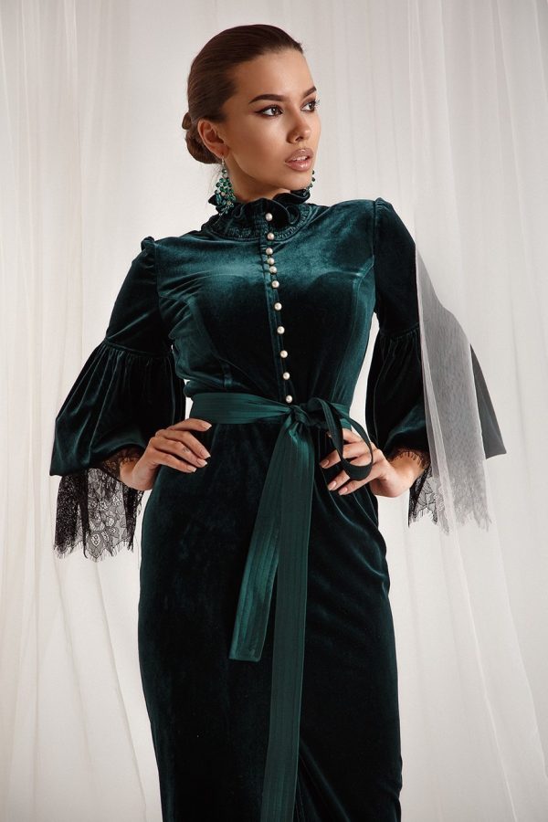 Елегантна оксамитова силуетна сукня з довгими пишними рукавами з шифону, з милими воланами з шифону спереду і внизу спідниці, ідеально сідає на будь-яку фігуру. Зручна застібка блискавка позаду центром.
