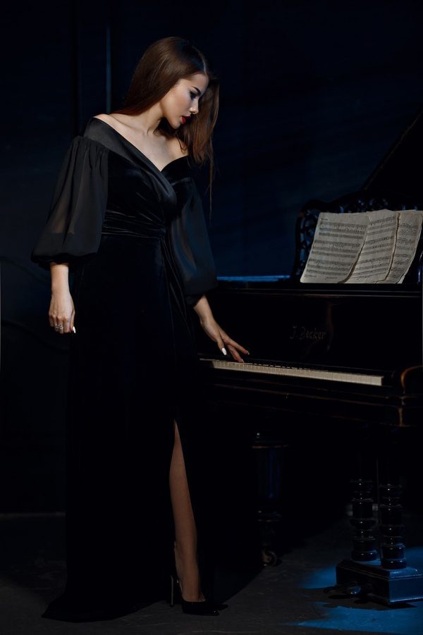 Елегантна сукня з чашками з королівського оксамиту на бавовняній основі, з ґудзиками з каменів на бретелях і з пишною спідницею довжиною нижче коліна.