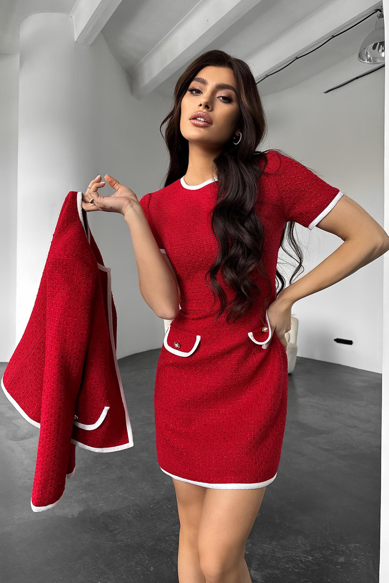 Твідова коротка сукня зі спідницею трапеція, з білою обробкою