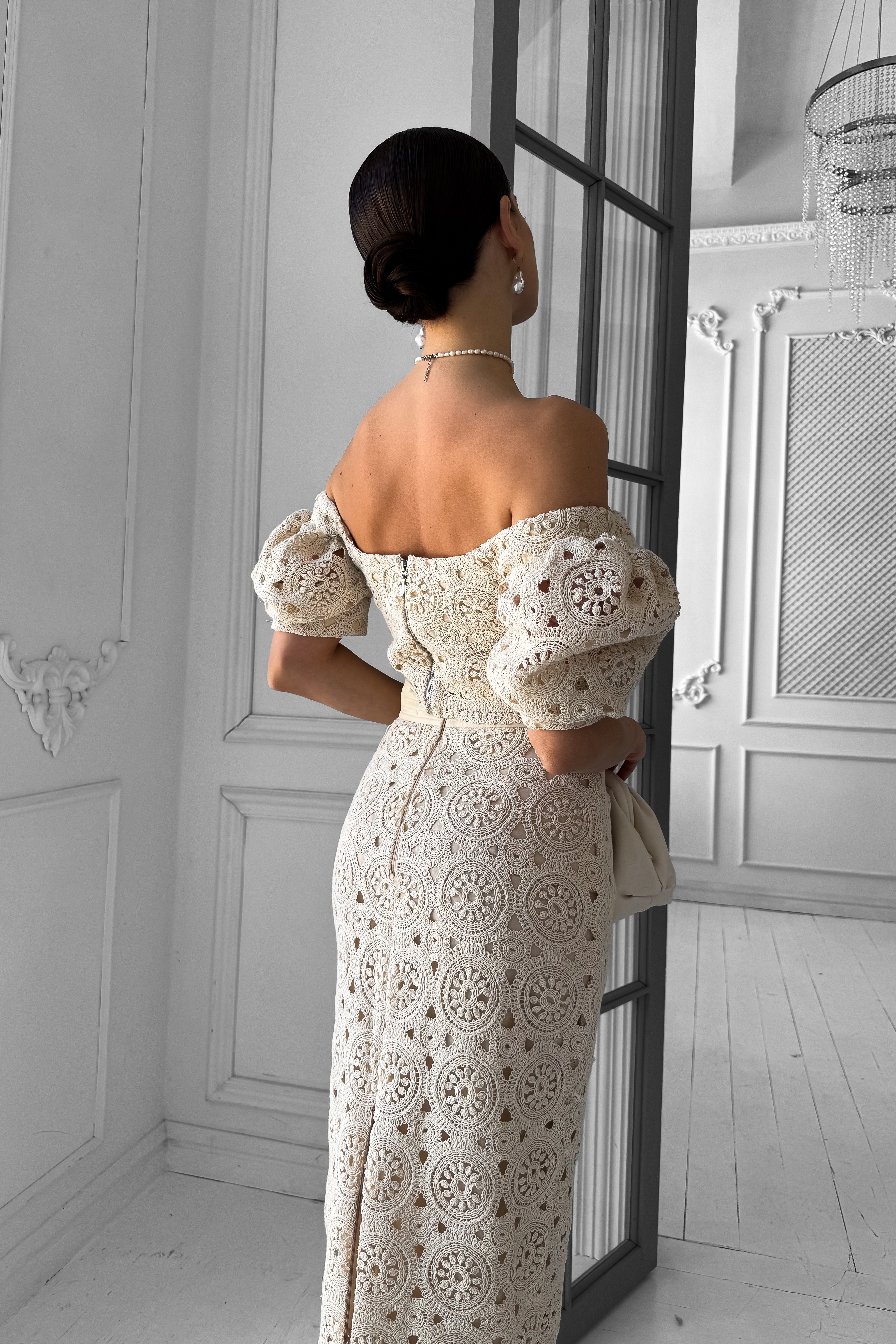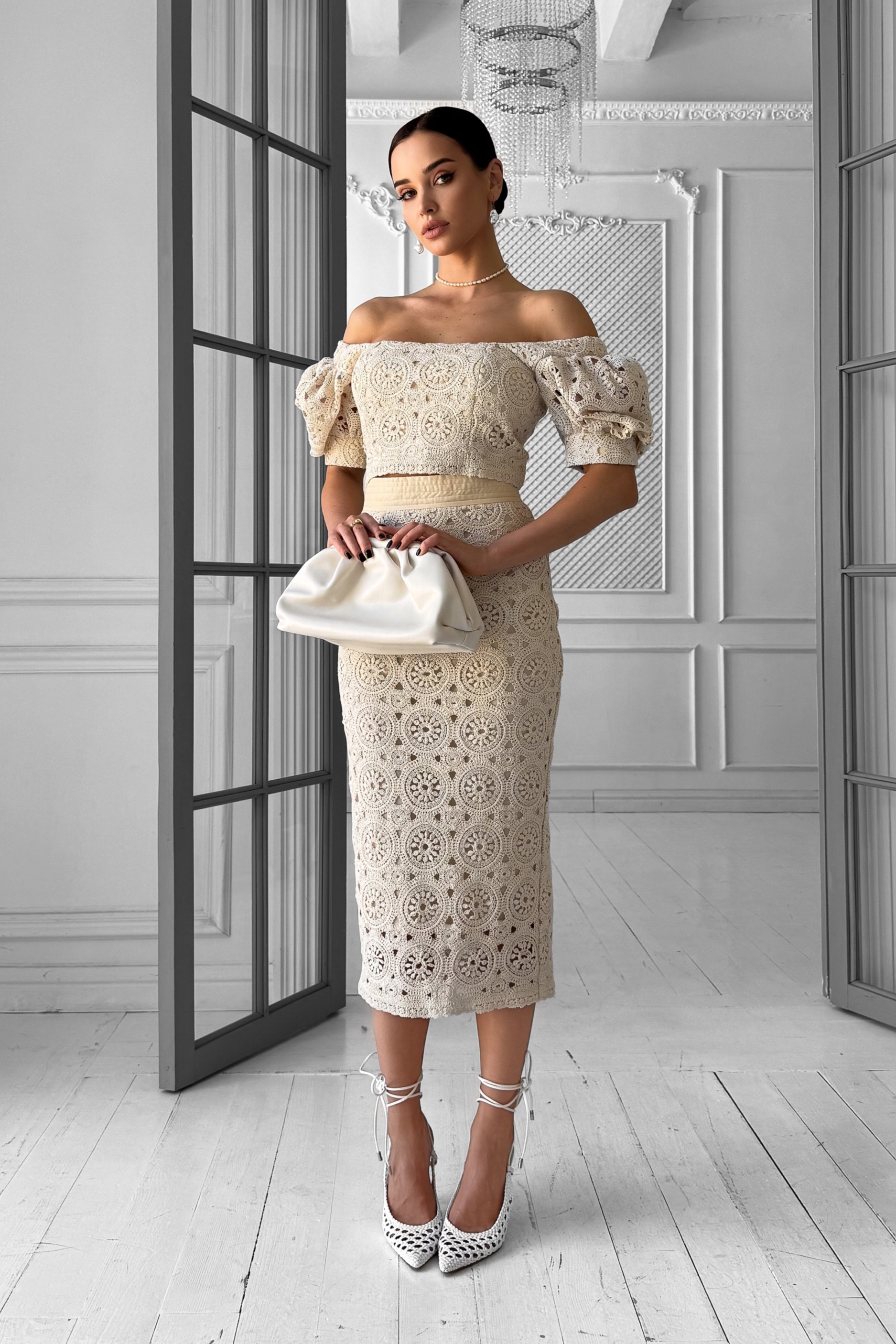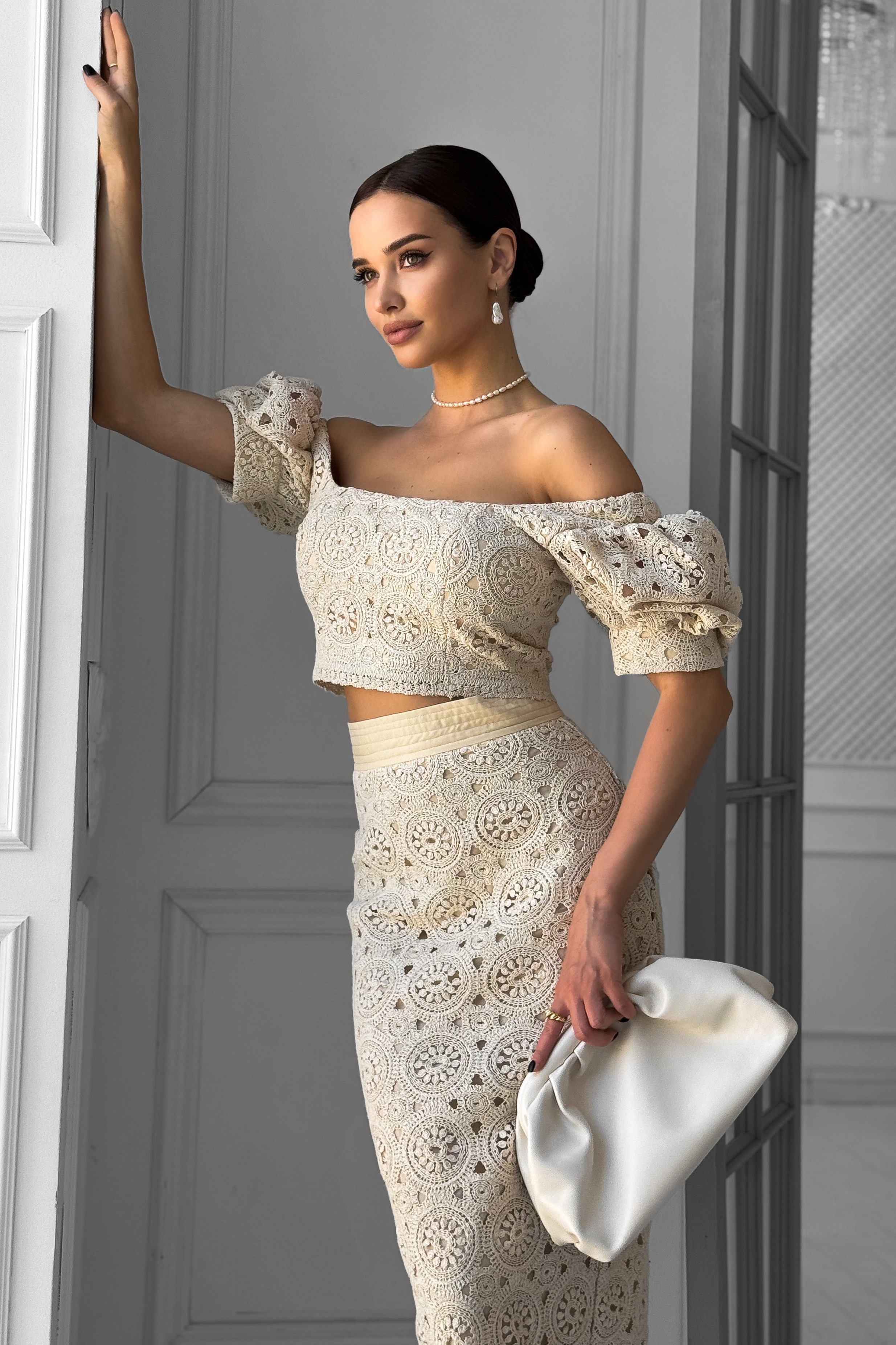 Костюм двійка з макраме: топ з рукавами ліхтарик і спідниця міді, Sarah Berlin